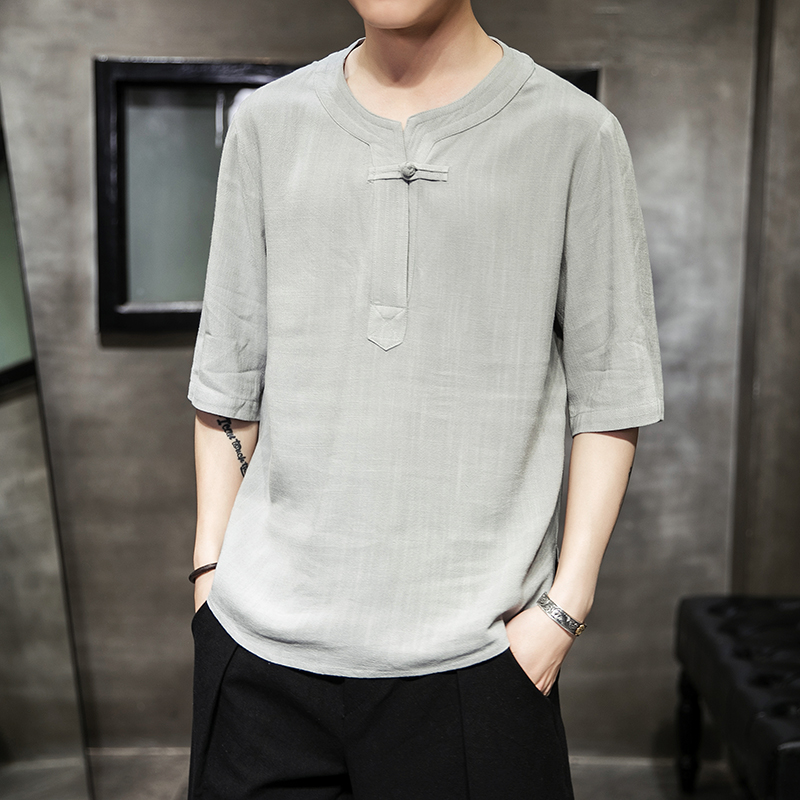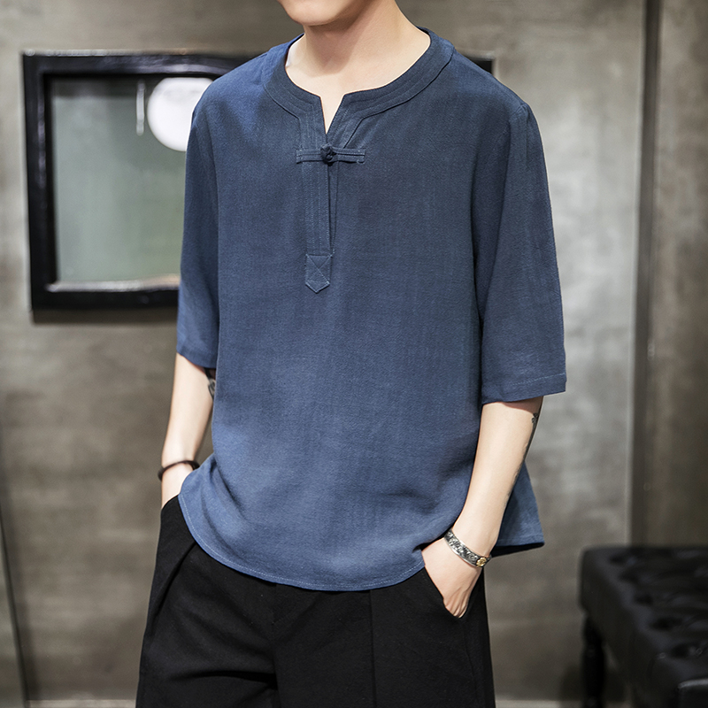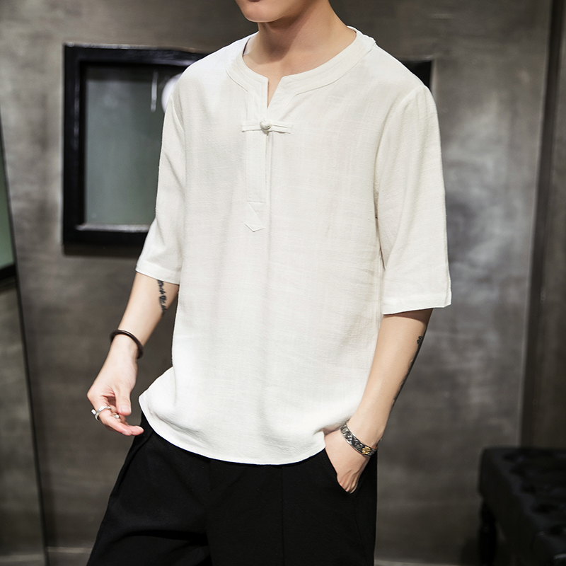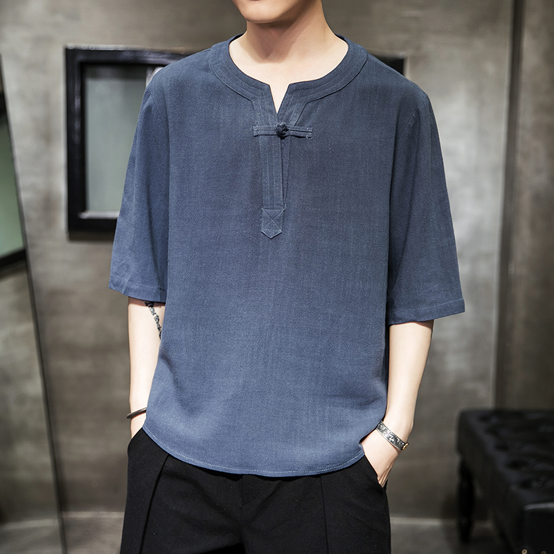 Chinese wind cotton short sleeve t-shirt men's tattoo young V collar coat half-sleeve tops large size tide flax loose summer
