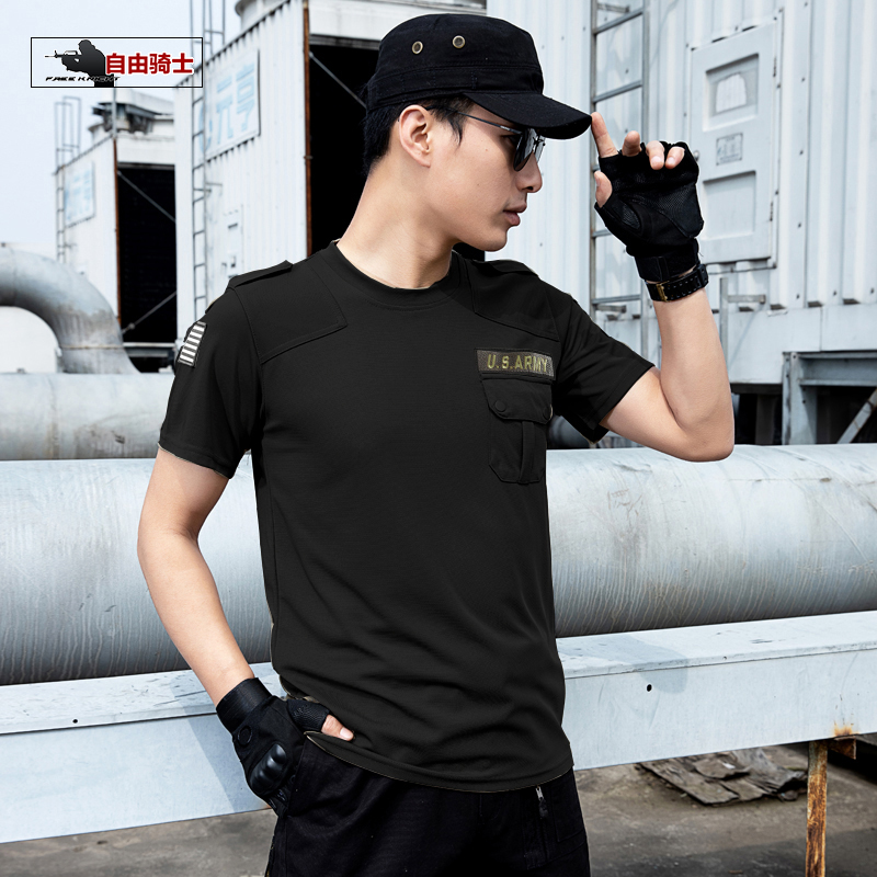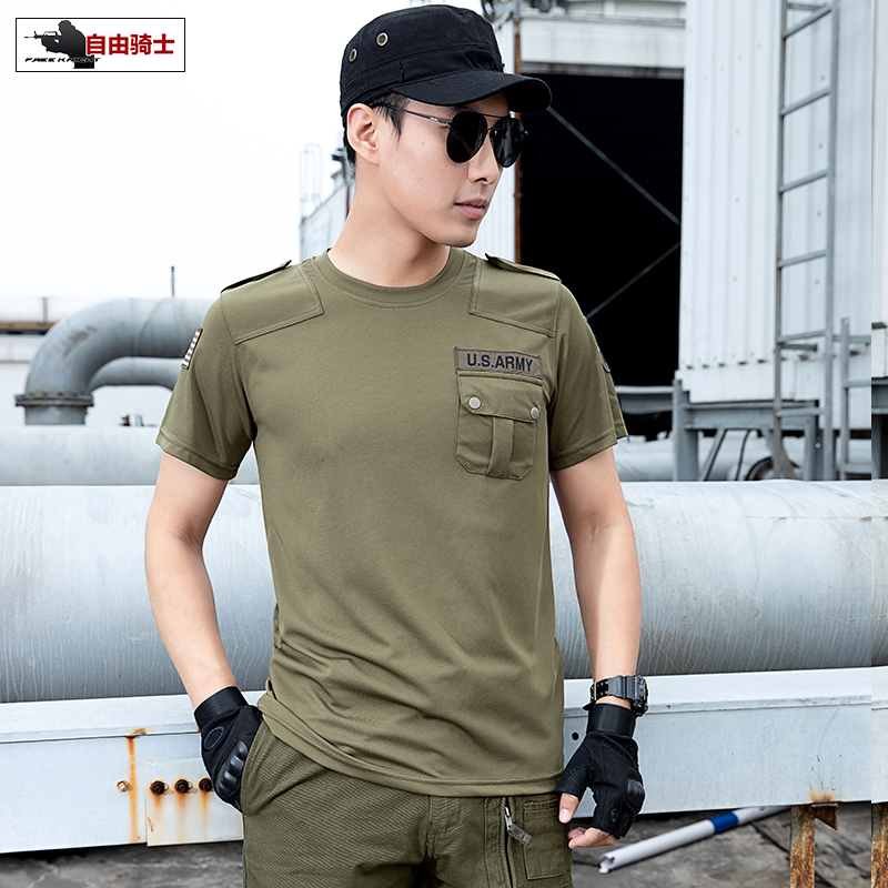 Summer work uniform military green camouflage short sleeve T shirt men slim stretch outdoor sports breathable round collar half sleeve fitness suit