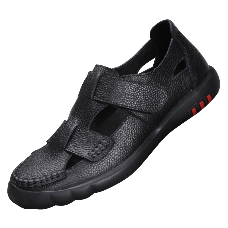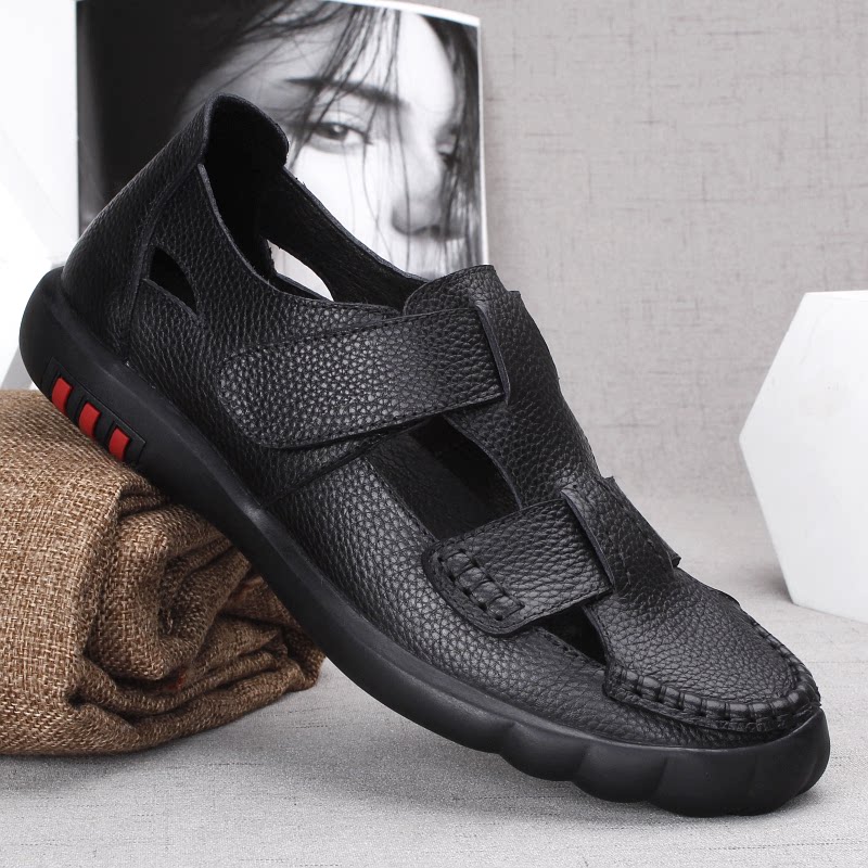 Leather men's sandals top layer cowhide soft surface soft bottom hollow business casual sandals summer hole shoes Baotou shoes