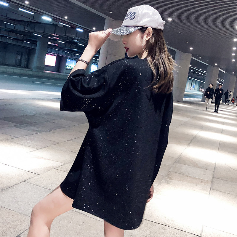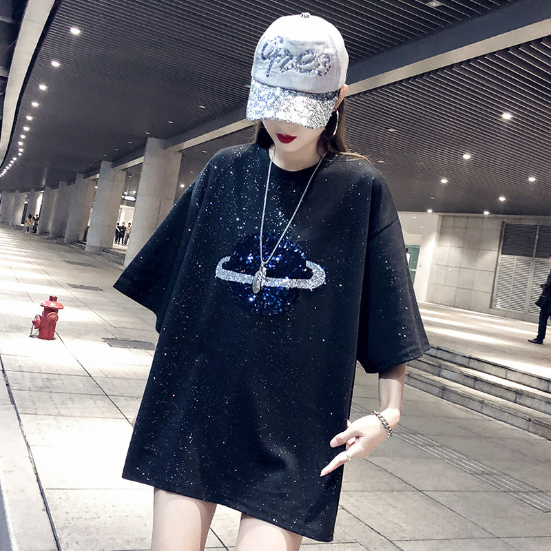 2022 new European stock big version loose T-shirt woman short sleeve net red sequins black bright shiny medium long prints