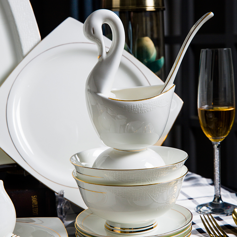 Jing Heng High-end bone china dishes set Home Chinese gold edge tableware set luxury bowls and plates glazed relief