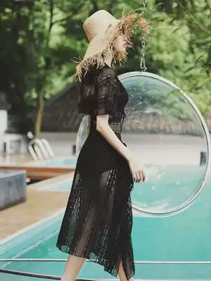 DK swimsuit women's three-piece conservative one-piece thin belly sexy black lace gather large size hot spring swimsuit