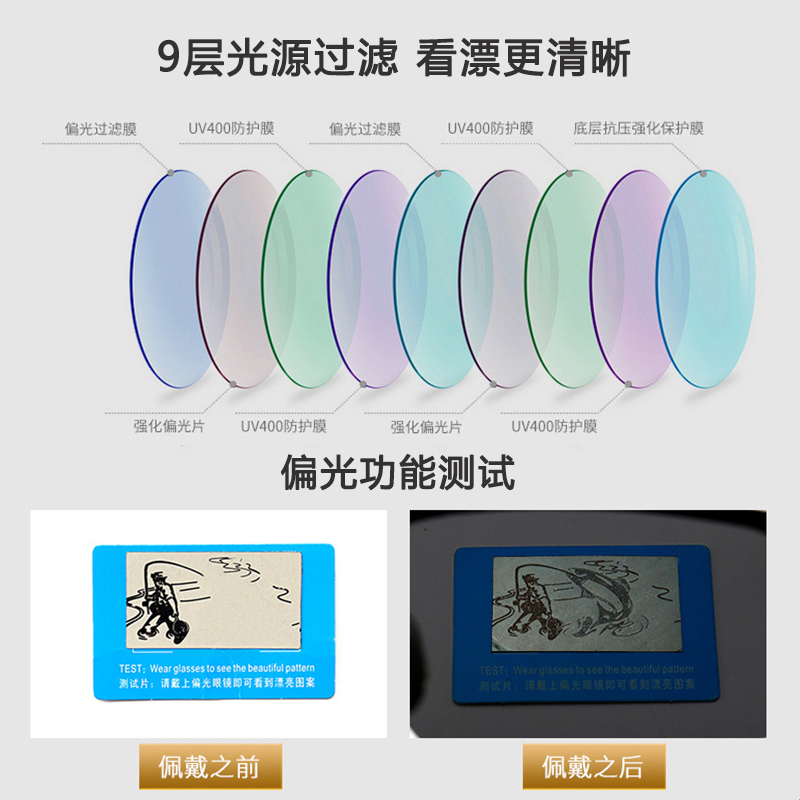 Black (clear day to remove water reflection backlight) Yellow (night to increase the brightness to remove blue light) Bronze (cloudy day to increase the contrast of fish drift)