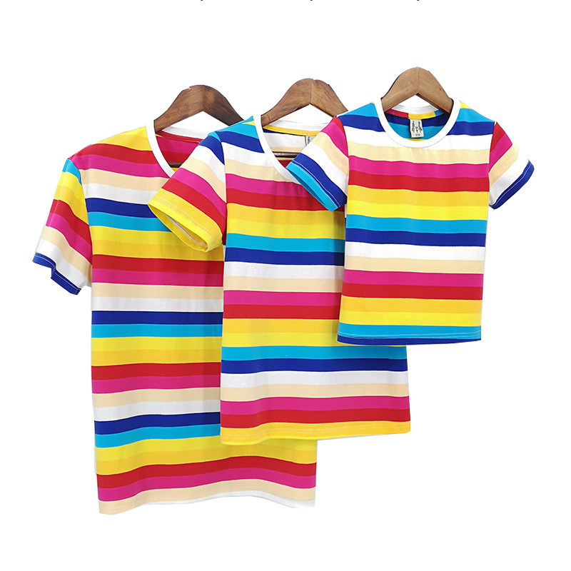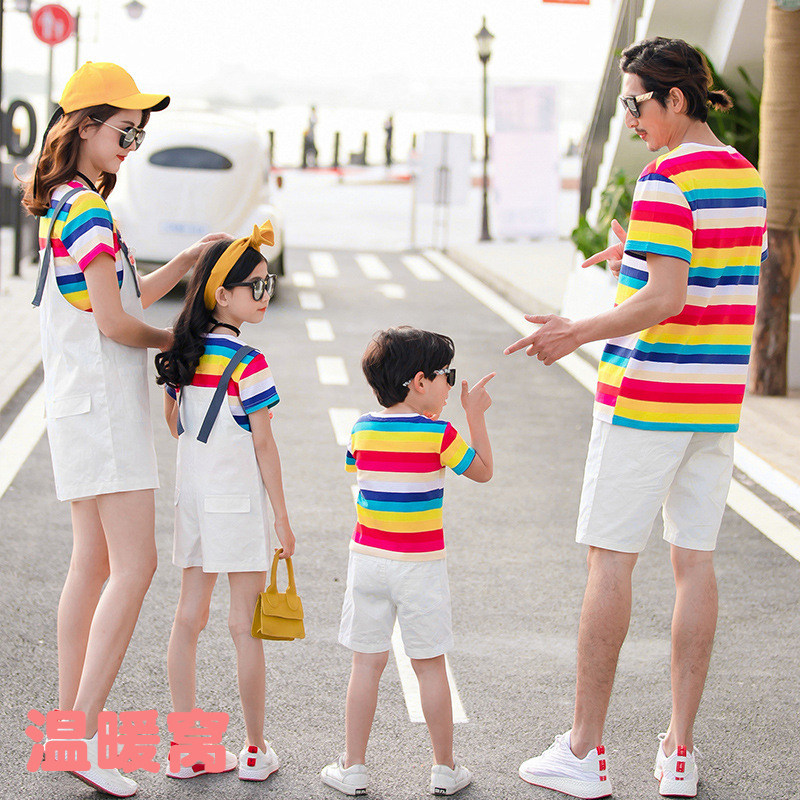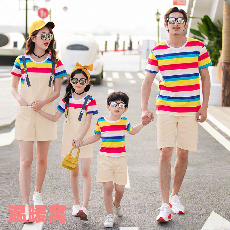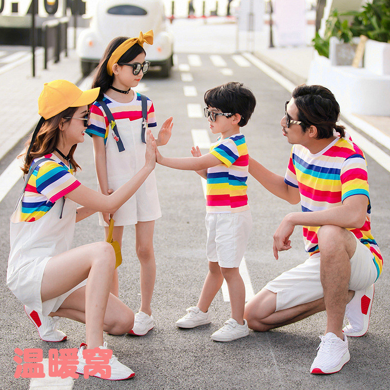 Western style color striped T-shirt mother and daughter holding baby bag pants mother and son father and daughter father and son family parent-child wear 2020 summer new trend
