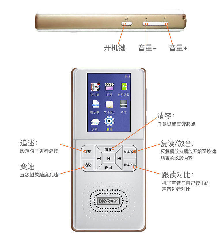 Dier D67 tape-free English repeater Rechargeable classroom recording MP3 MP4 playback student electronic dictionary