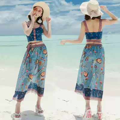 2020 new couple swimsuit three-piece conservative two-piece flat corner belly Harajuku wind small floral beach Beach Seaside