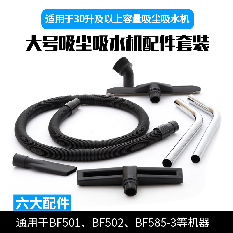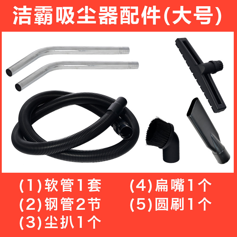 Long flat mouth round brush, large dust pick, large water pick, small dust pick, small water pick, large curved steel pipe, 2 small straight steel pipes, 2 30L dust bags, 70L dust bags, large pipe long joint, large pipe short joint, small pipe length catch