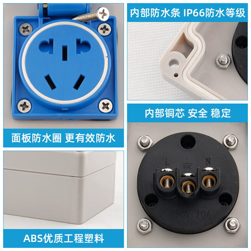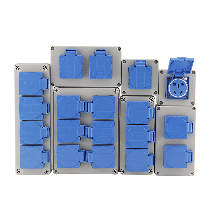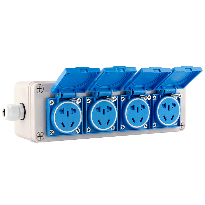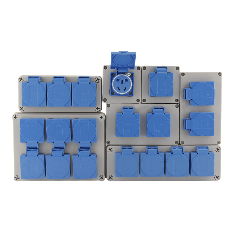 Single-linked waterproof socket (five holes 10A) Blue Single-linked waterproof socket (five holes 10A) Red Single-linked waterproof socket (five holes 16A) Blue Single-joint waterproof socket (three holes 16A) Blue