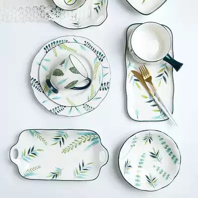 Nordic ceramic bowl plate household simple breakfast tableware creative soup bowl instant noodle bowl large double ear baked rice bowl shallow grass