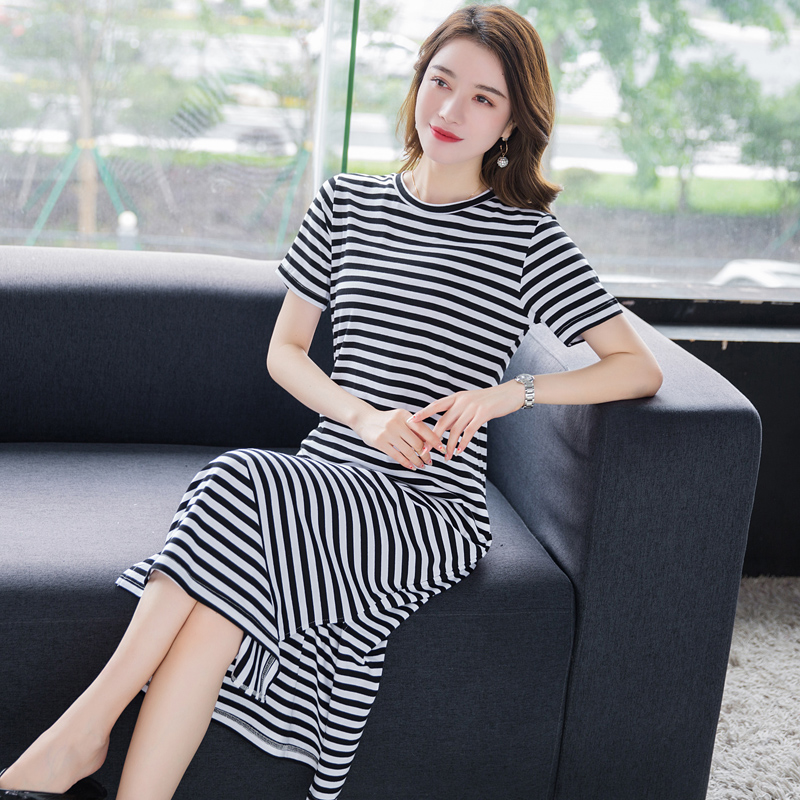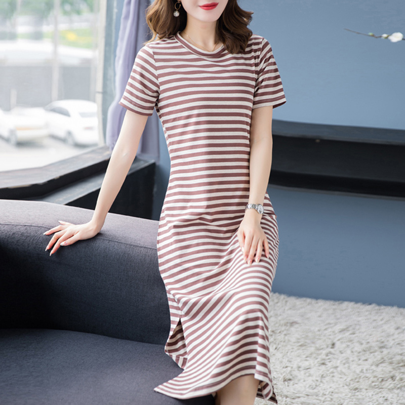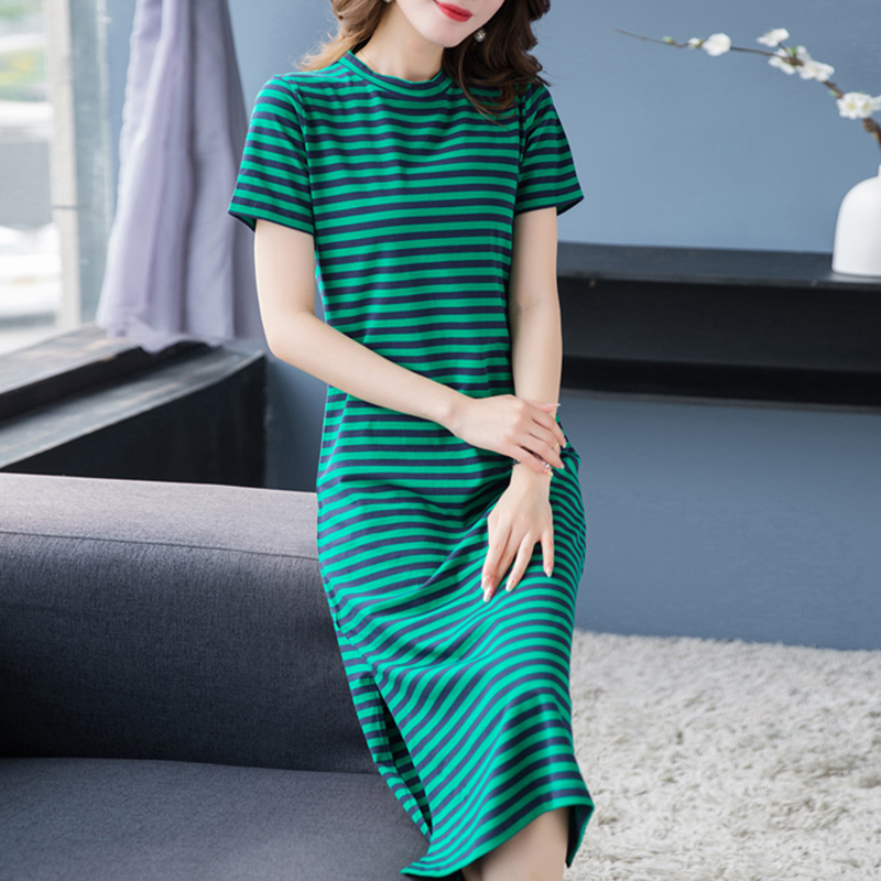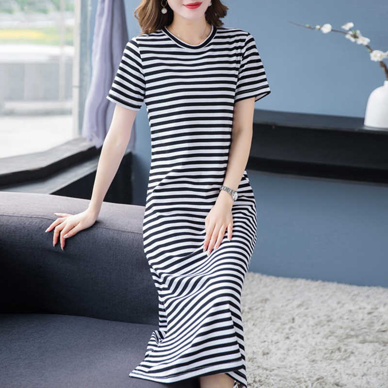 Mid-length t-shirt women's striped cotton short-sleeved t-shirt dress with slits over the knees to cover the buttocks 2022 new