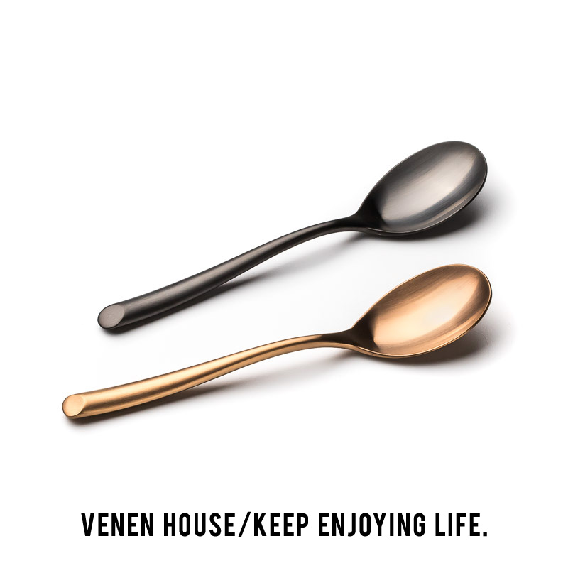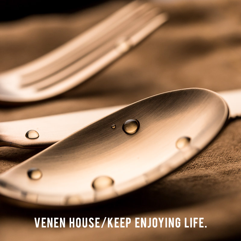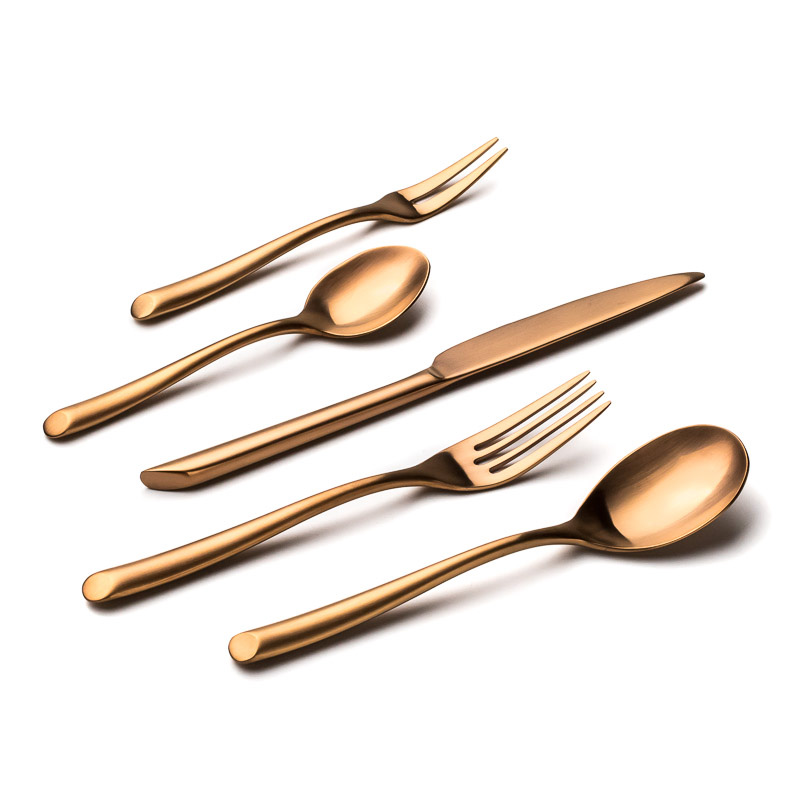 Titanium-plated dark gold coffee spoons Titanium-plated dark gold dessert fork Titanium-plated dark gold main dining spoon Titanium-plated dark gold main dining forks Titanium-plated dark gold steak knives Titanium-plated gray-black coffee spoons