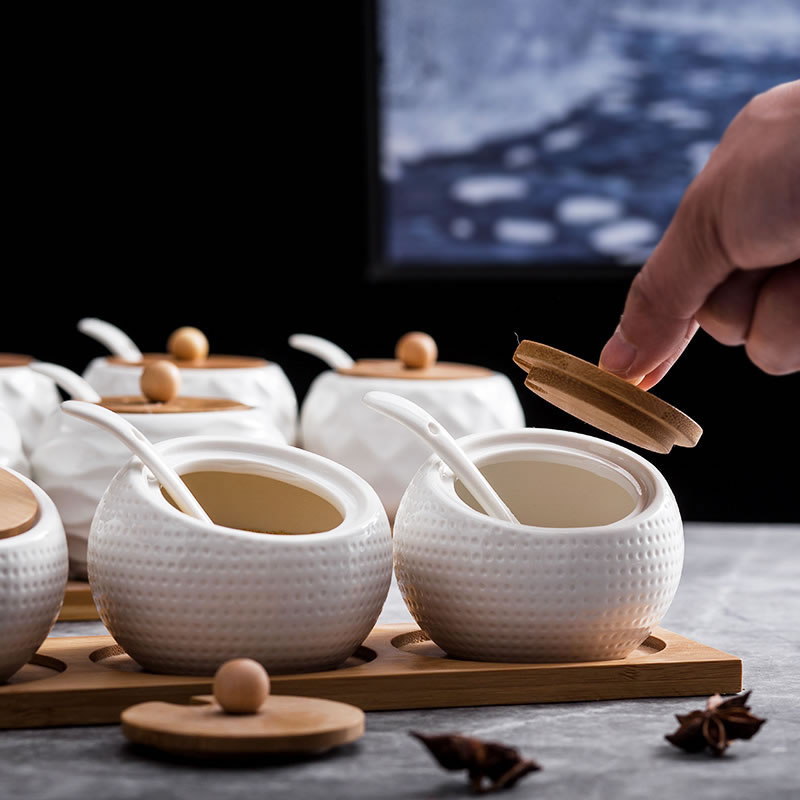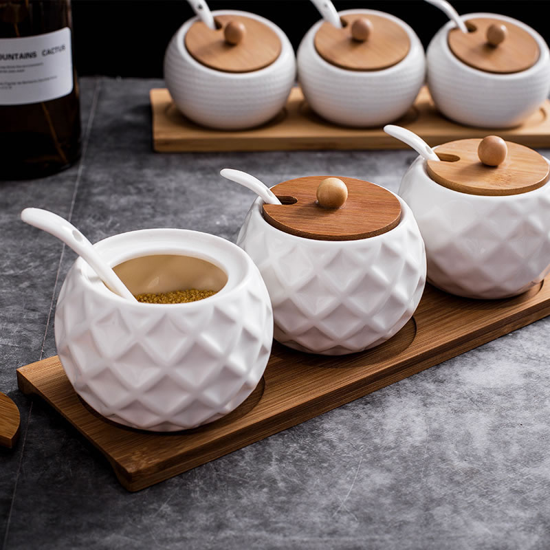 Ceramic seasoning box set household kitchen seasoning tank salt sugar chicken essence chili seasoning bottle storage box three-piece set