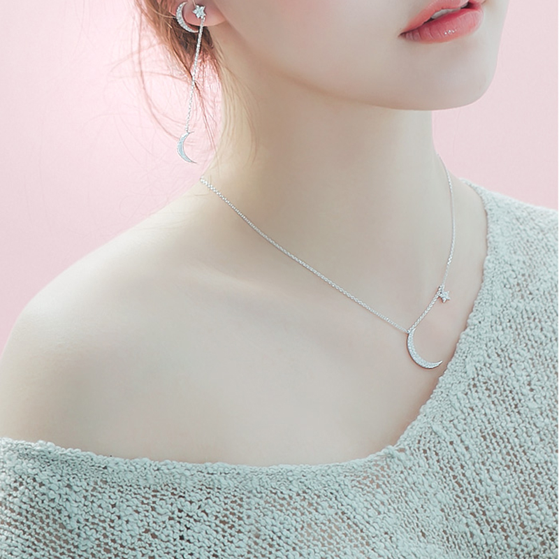 s925 silver star moon necklace female Korean version minimalist personality 100 lap zircon stone pendant cold light wind net red tides neck necklace