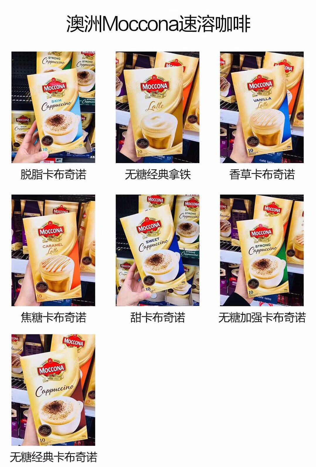 (Classic) cappuccino (skimmed) cappuccino (reinforced) cappuccino caramel with iron classic take iron vanilla with iron 1 tried and unsold taste random mint chocolate take iron Danish maple sugar with iron soil