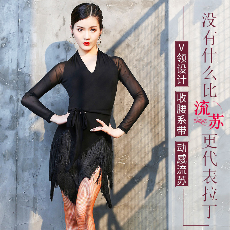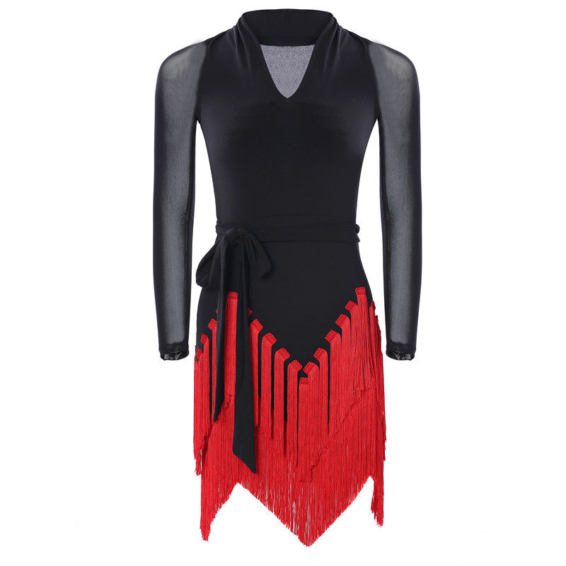 Fire Leaves Flowers 2021 Latin dance Ocean Dress New Adult Women's Body Fluid Suskirt V Collar Practice Long Sleeve Performance Dress