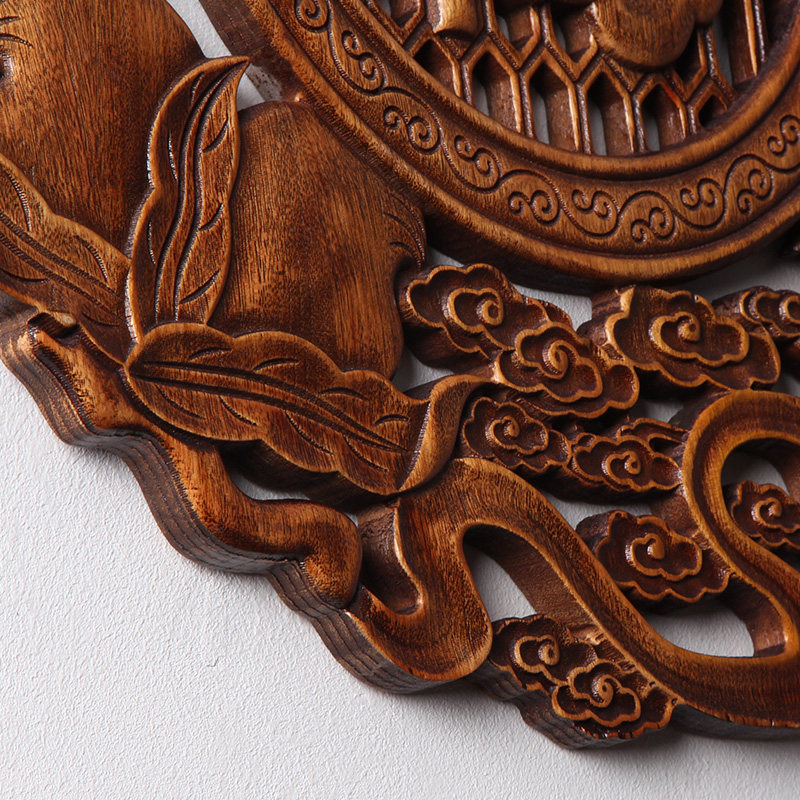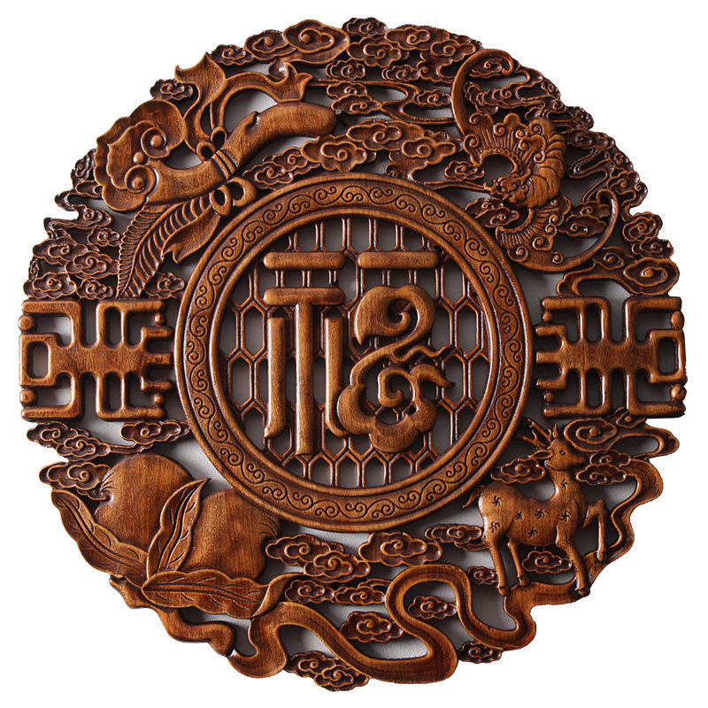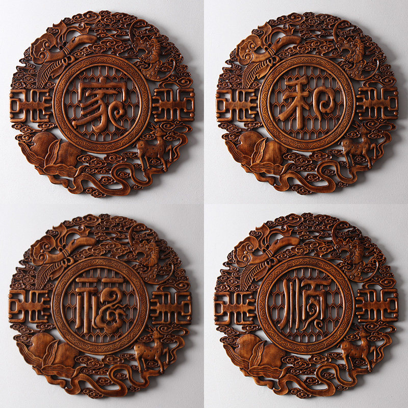 Dongyang wood carving camphor wood pendant round Chinese style living room decoration painting background wall solid wood hollow wall hanging home and Fushun