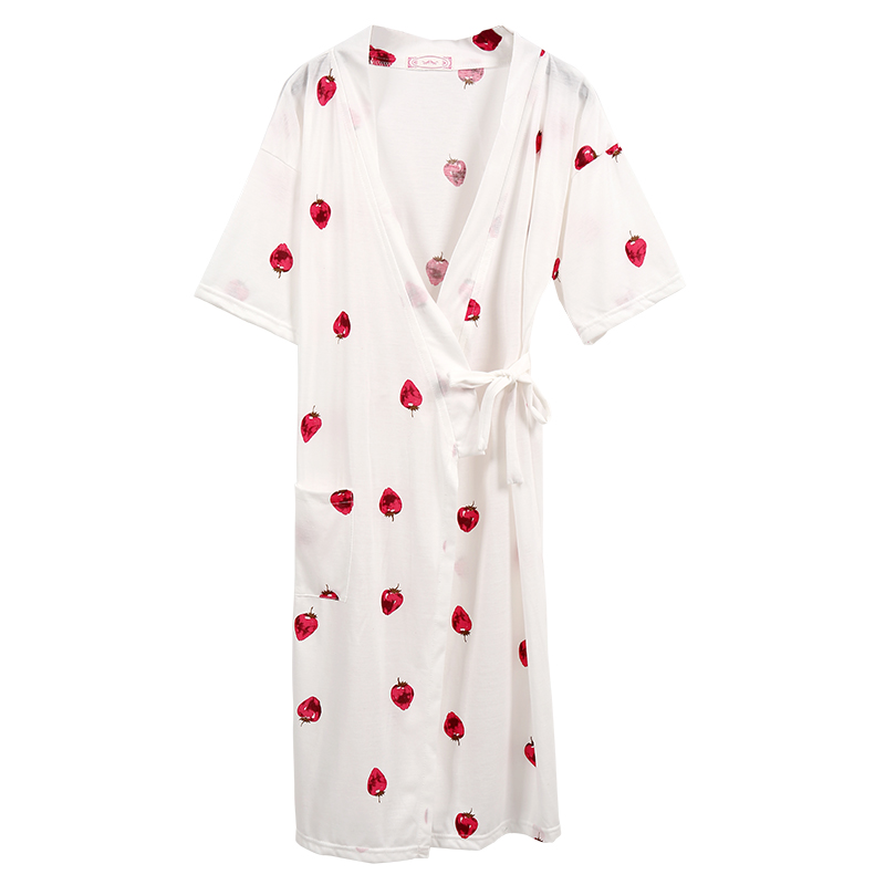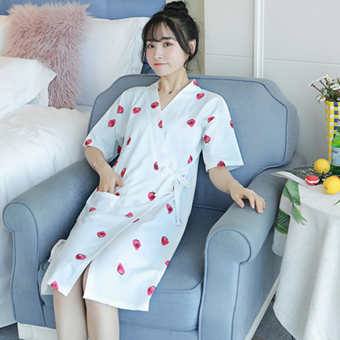 Sleeping Robe Women's Summer Pure Cotton Bathrobe Lady Midlength Version Pyjamas Kimono Strawberry Pyjamas and strawberry Sleeping Spring and Autumn Thin Family Clothes
