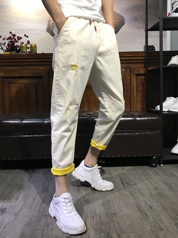Fast hands with the same men's ripped beggar jeans trend loose national trend Dad pants social guy nine-point pants thin