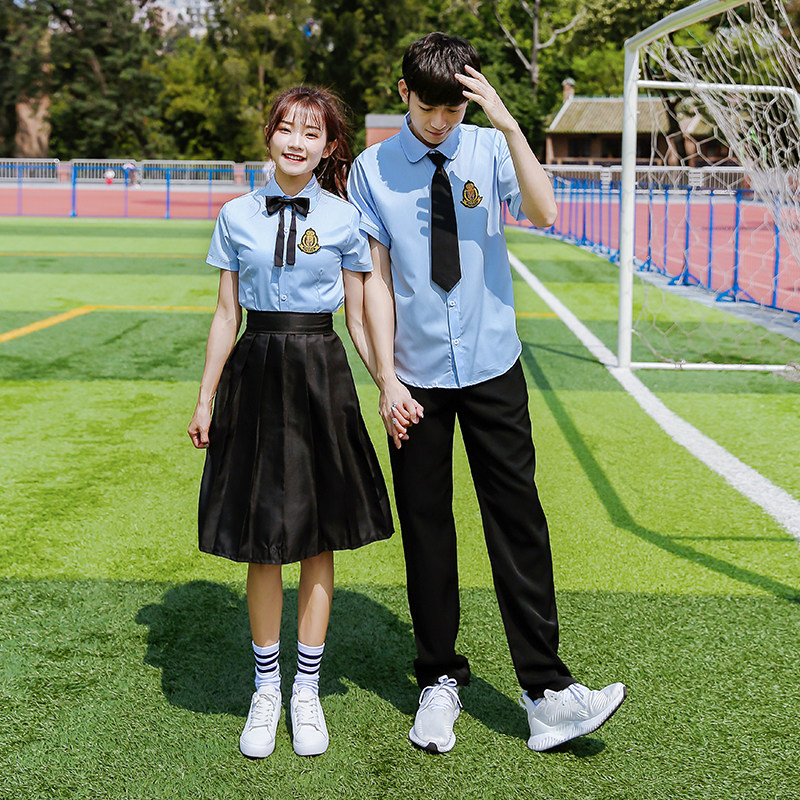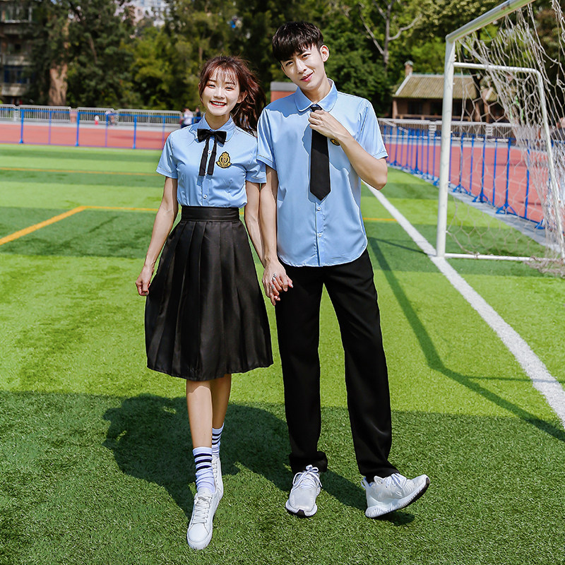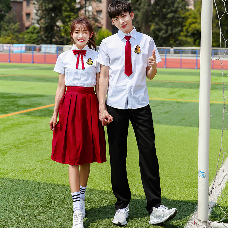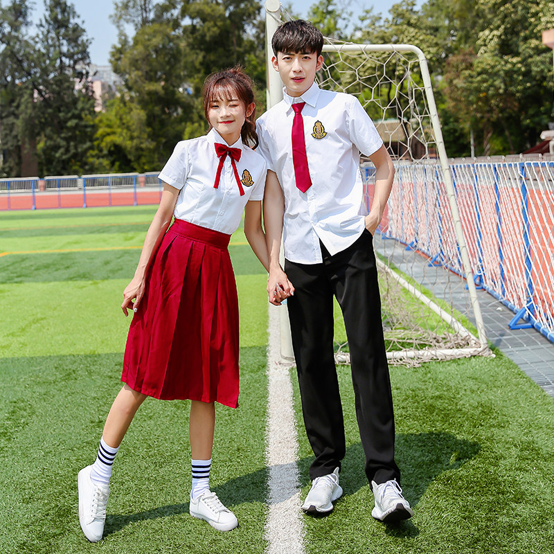 Female short sleeve white shirt red long skirt woman short sleeve blue shirt black trousers male short sleeve blue shirt black pants male short sleeve striped shirt black pants female long sleeve white shirt black long skirt single piece