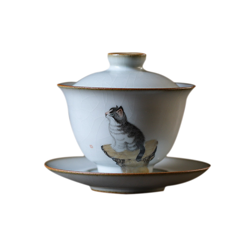 Pure hand hand-made rukun kiln ceramic hand-painted cat kung fu tea cover bowl of youth tea cup