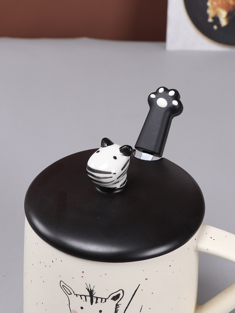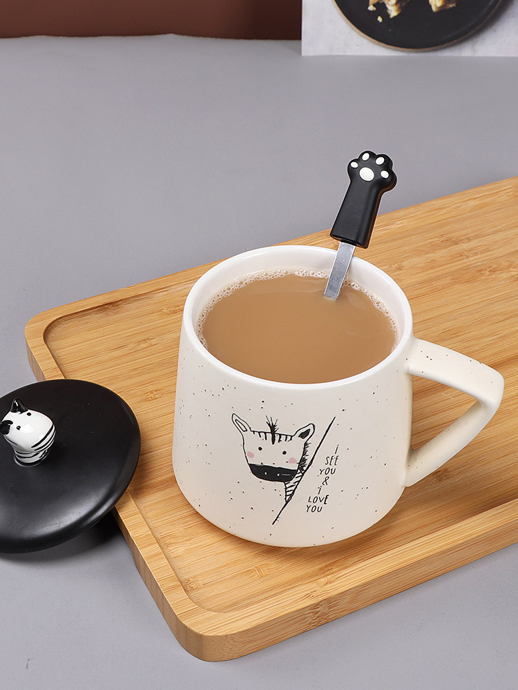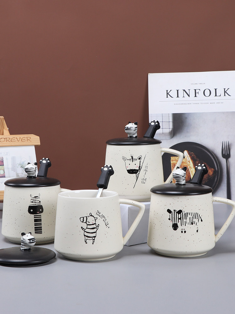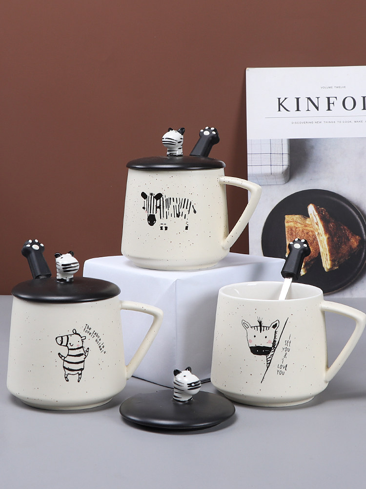Creative simple zebra ceramic cup personalized water cup female Korean mug with lid spoon breakfast cereal milk cup