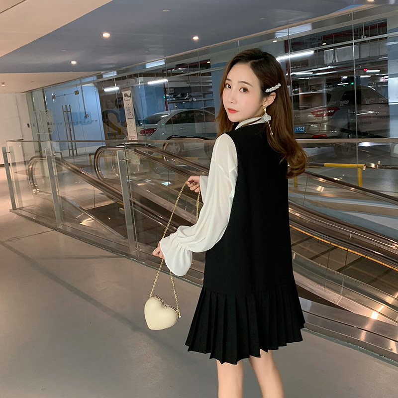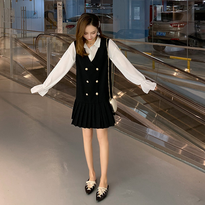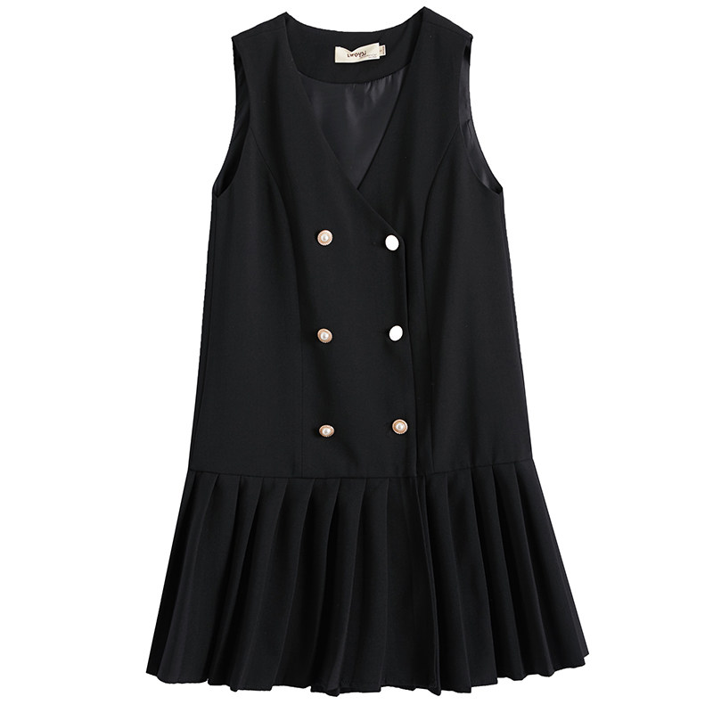 Casual wind vest women 2021 spring new double-breasted medium and long version of black pleated horse clip sundress tide