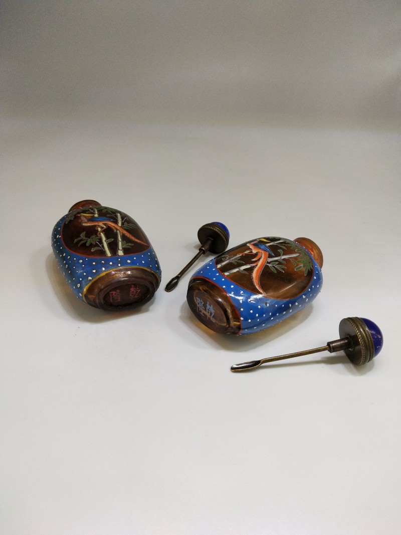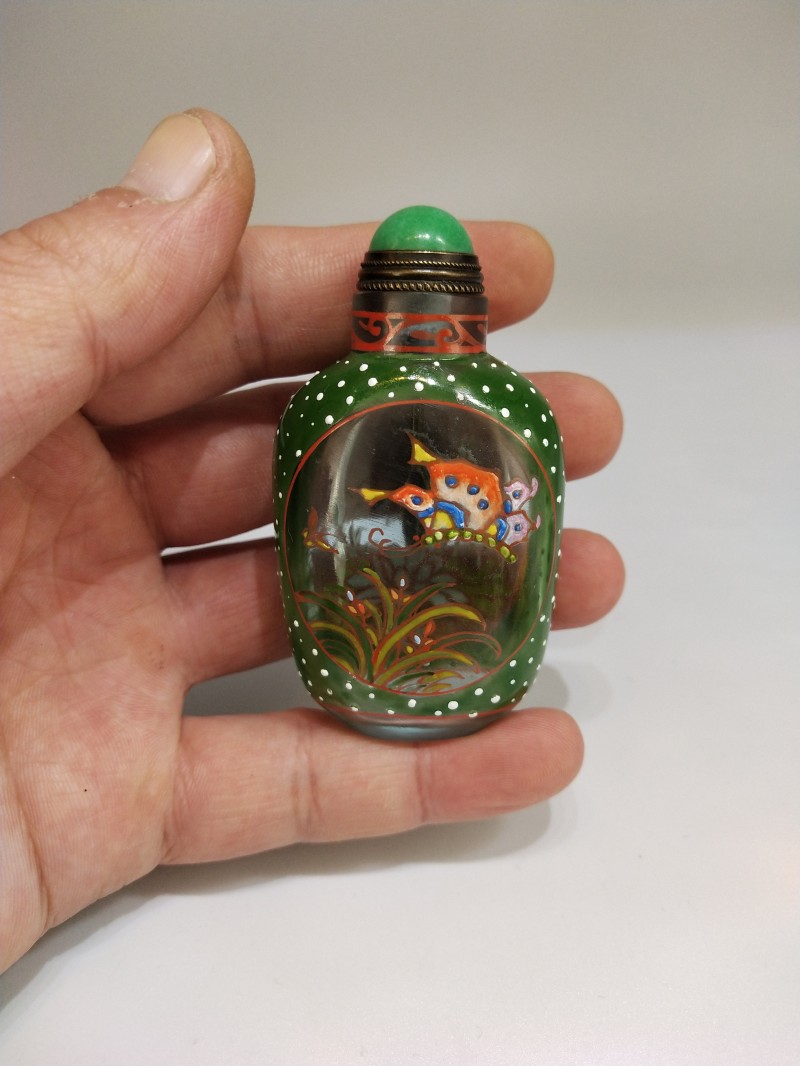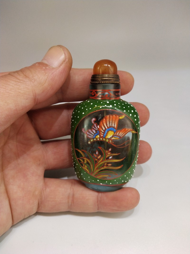 Imitation Qianlong ancient play transparent glass practical snuff bottle hand-painted green and blue enamel pastel flower and bird figure ornament gift