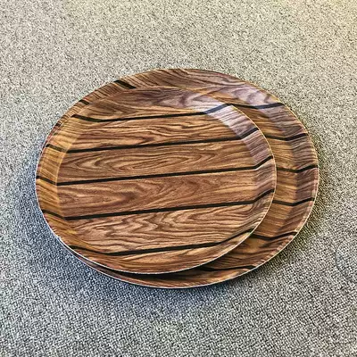 Non-slip round tray wood grain color plastic tea tray dinner plate thickened hotel service plate PU leather non-slip layer