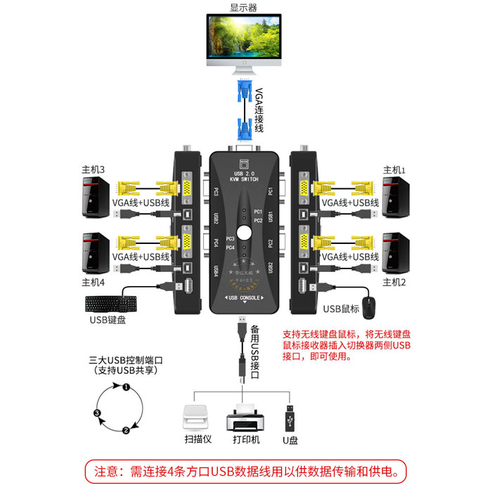 KVM quad-mouth switcher VGA and USB4 outlet 4 into 1 out computer screen sliding mouse keyboard cosharing