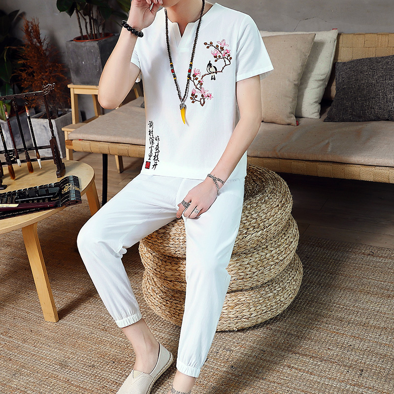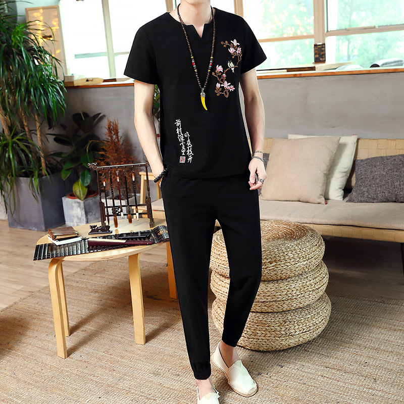 Summer linen suit male cotton linen short sleeve T shirt fashion summer V retro Chinese style leisure 2021 new clothes