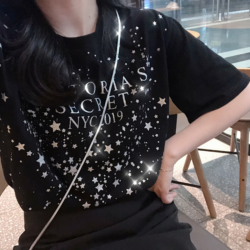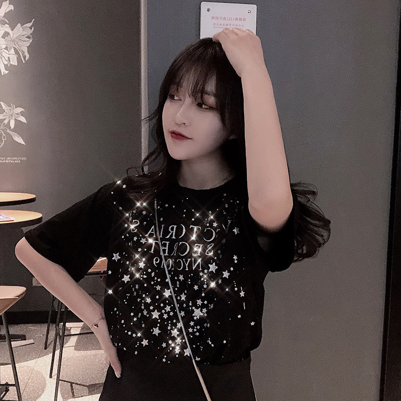 (Clearance) 2022 new summer ins tide Hong Kong style sequins net red black T-shirt women's cotton loose short-sleeved top