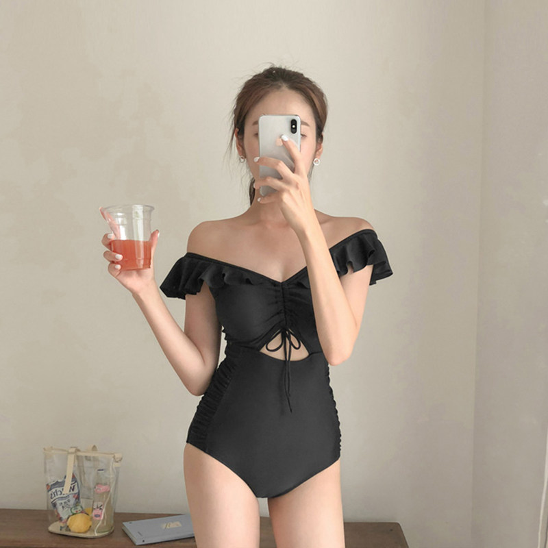 Korean version of the new one-character shoulder swimsuit female retro sexy little fragrance wind backless body cover belly slim black swimsuit
