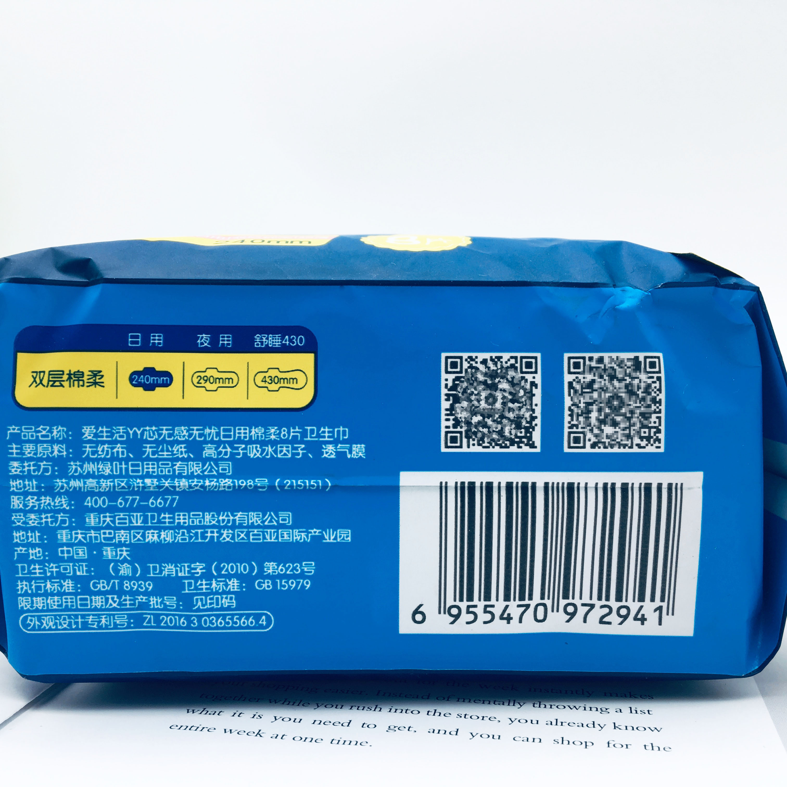 Green leaf Love life YY Core No sense of worry Sanitary Cotton Daily Cotton Soft and Breathable Aunt's towel 8 pieces 240