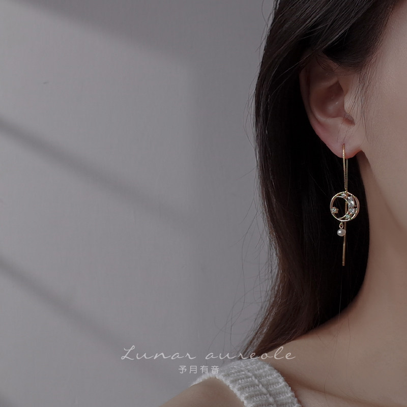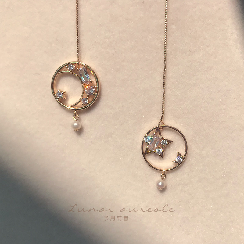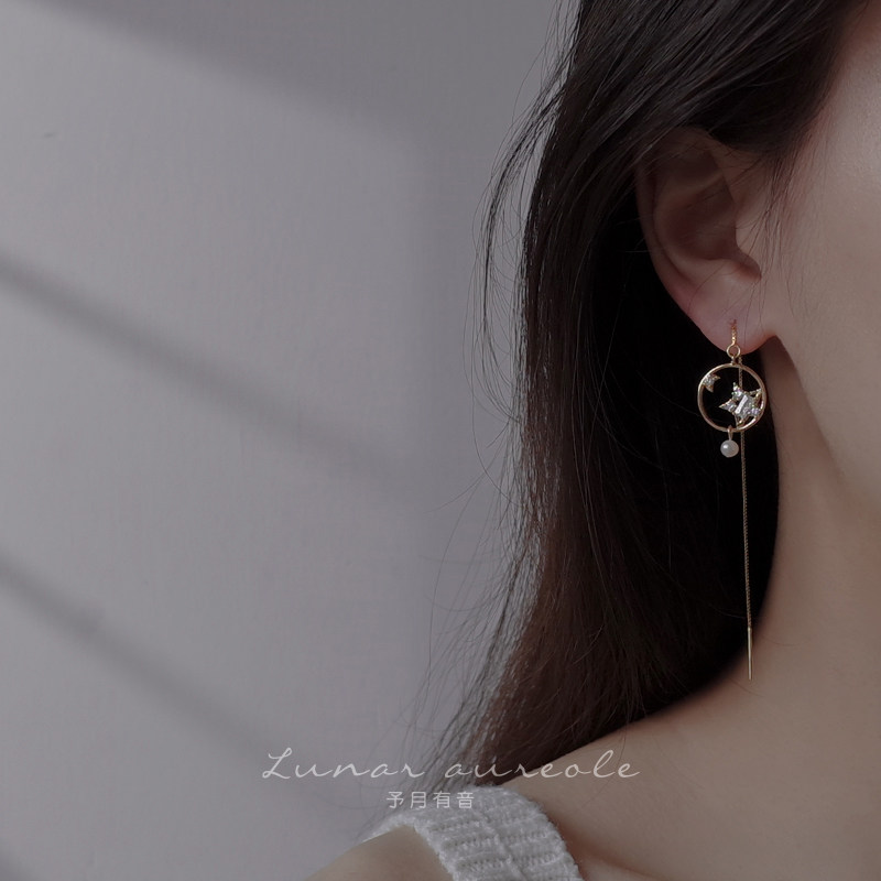 YoMonth with sound good night925 silver ear line Long version Delicate Ear Pendant Star Moon Element Earrings Temperament Gift