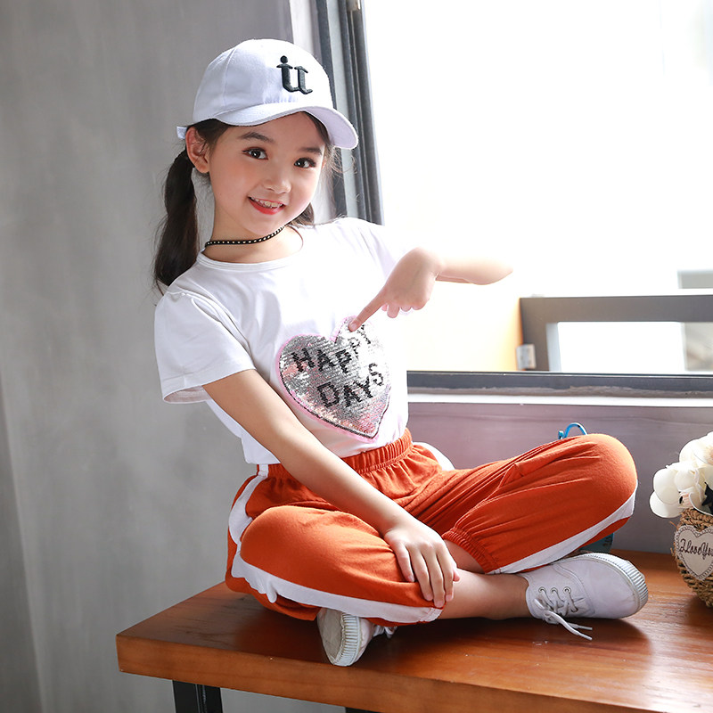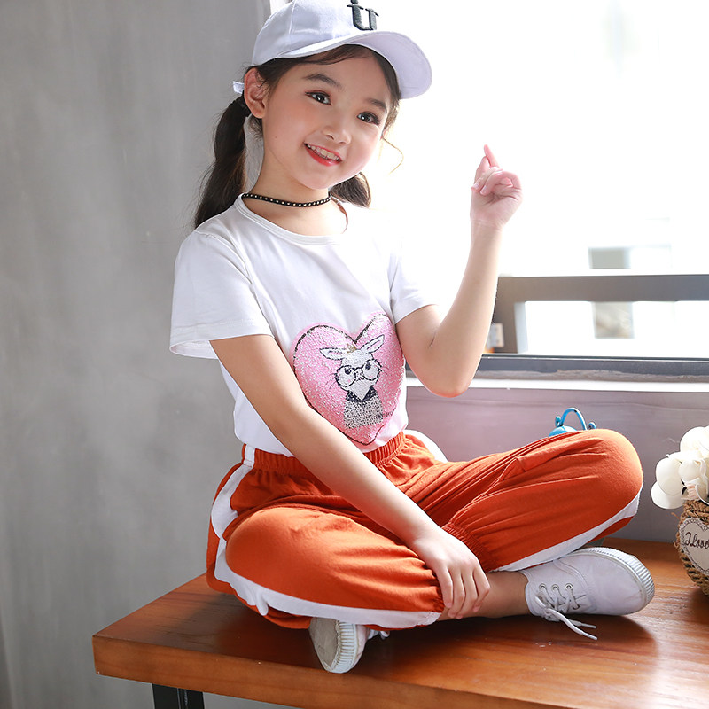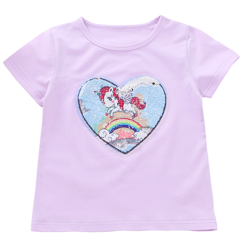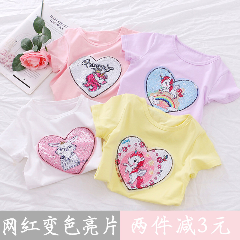 Girls' cotton color changing sequins short-sleeved T-shirt summer thin section children's baby cartoon round neck Western style casual top