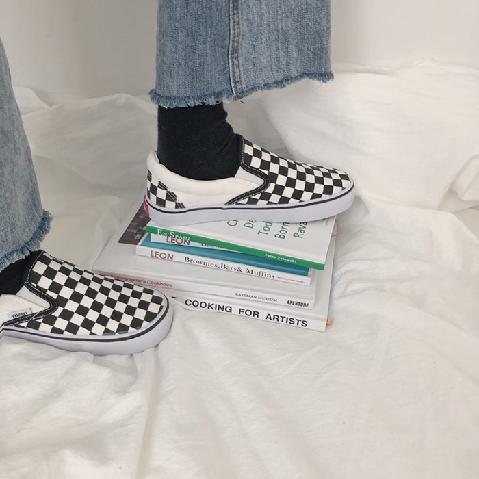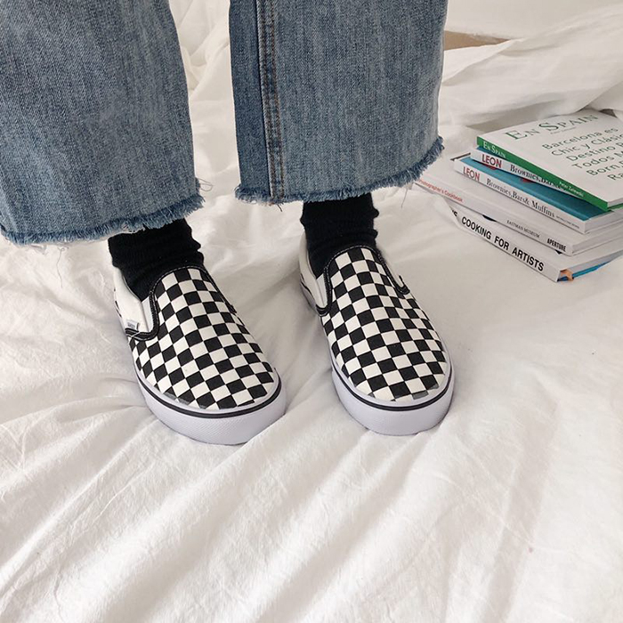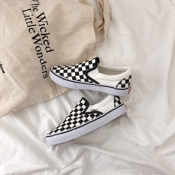 Jiang Zhishu ins with the Korean ulzzang retro black and white grid canvas shoes female lazy slip-on skateboard shoes