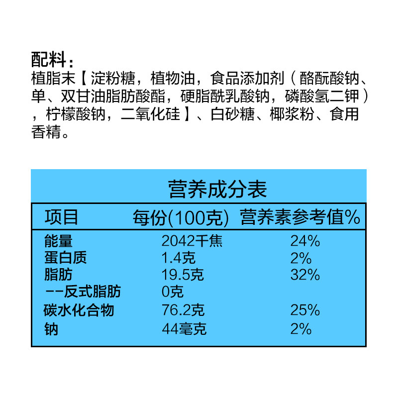 Non-dairy creamer (starch sugar vegetable oil food additives (sodium tyrosinate mono-diglyceride fatty acid ester sodium stearoyl lactylate dipotassium hydrogen phosphate) sodium citrate silicon dioxide) white sugar