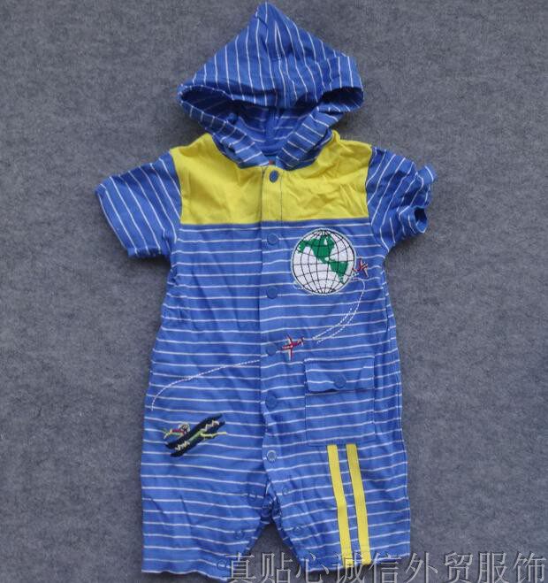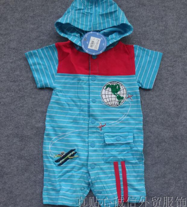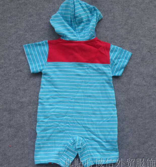 Export European pure cotton boy baby hooded short-sleeved flat-footed romper front snap embroidered romper jumpsuit short