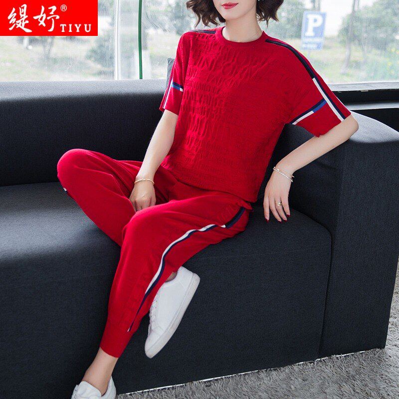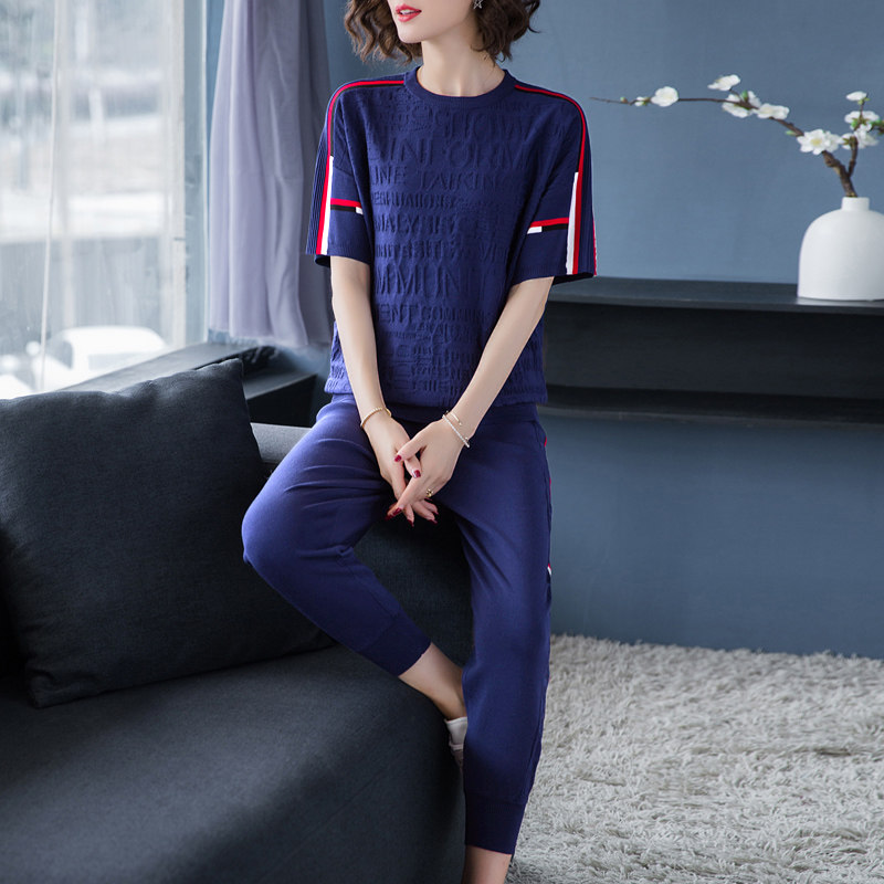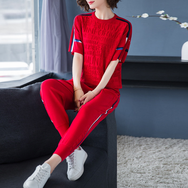 Ice silk casual sports suit women's 2020 summer new short-sleeved fashion loose knitted pullover casual top two-piece set