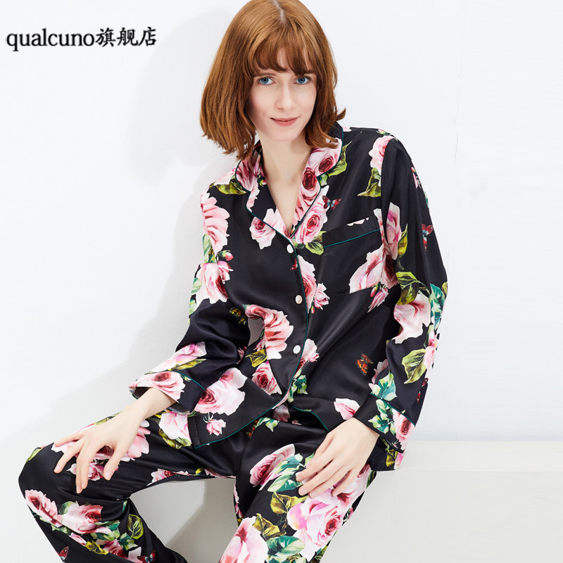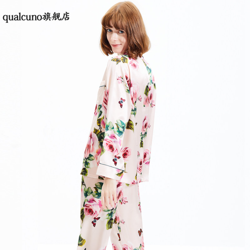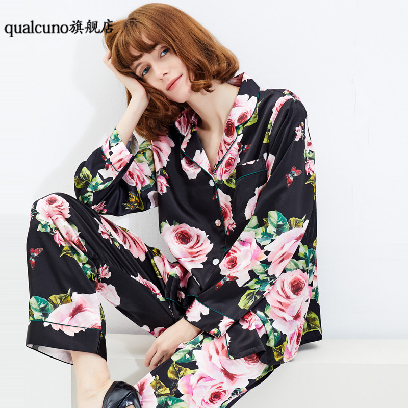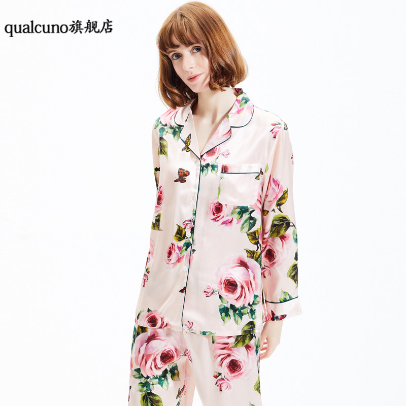 Fashion silk pajamas women's spring and summer long-sleeved trousers thin silk two-piece suit printed mulberry silk home wear