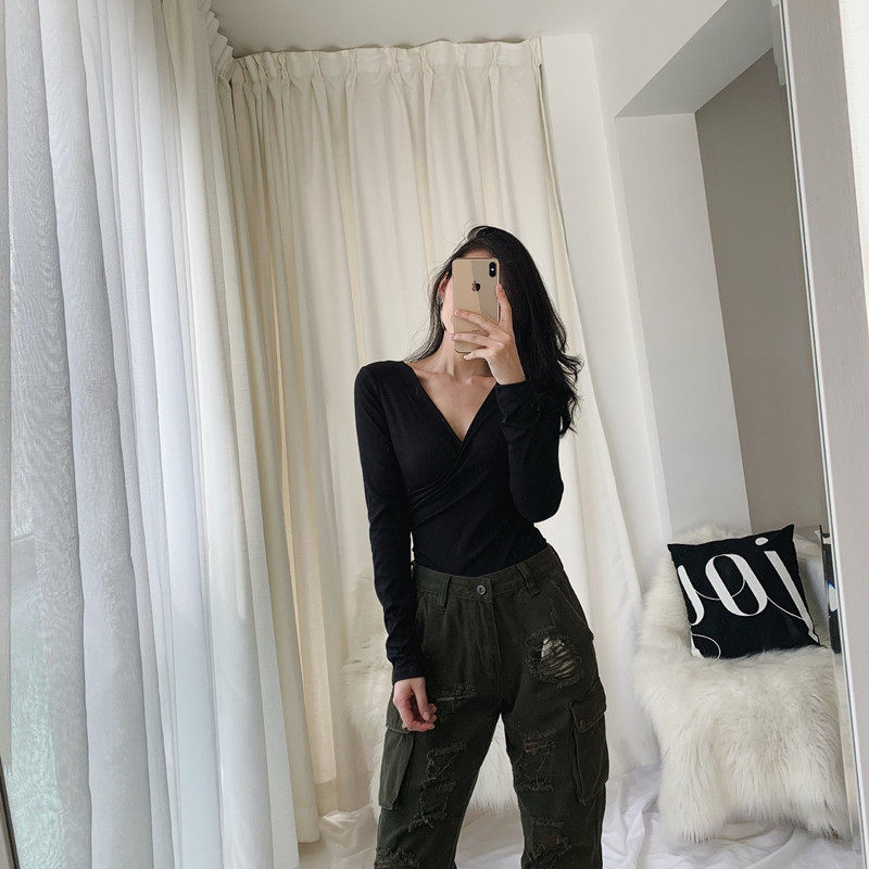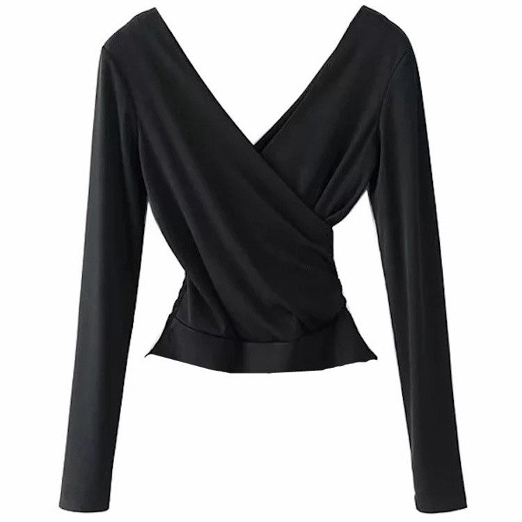 Black mid-sleeve front and rear top Black mid-sleeve yarn net top Black long-sleeved front and rear top