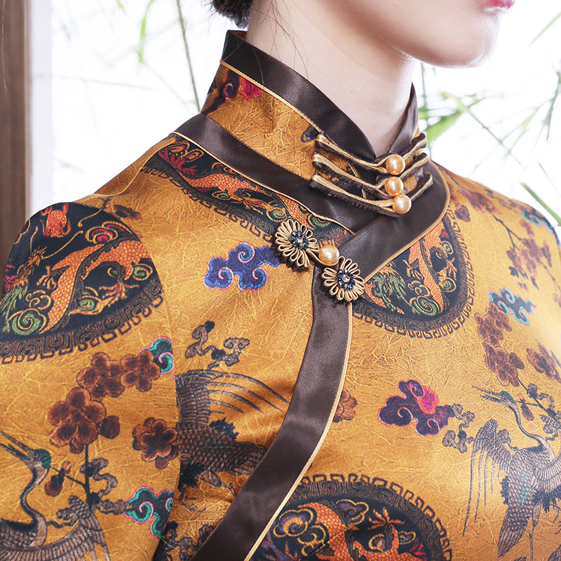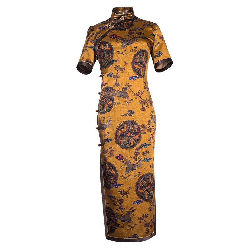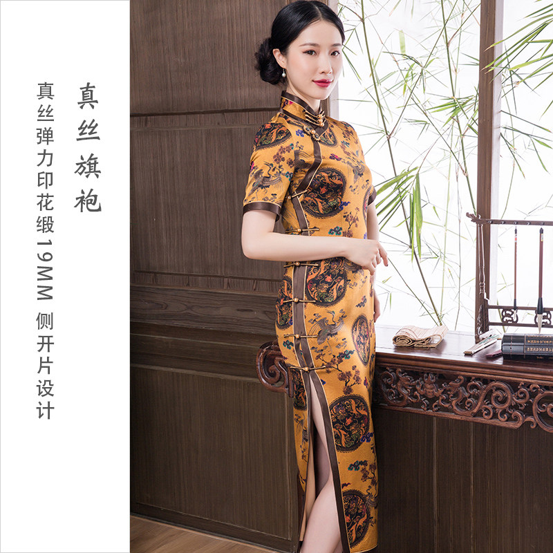 2021 summer new vintage heavy silk printing fashion full side open traditional medium and long version of the dress cheongsam dress