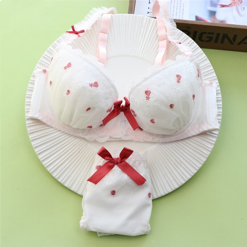 Japanese sweet and cute underwear suit female girl heart thin cup lace bow white underwear with steel ring autumn