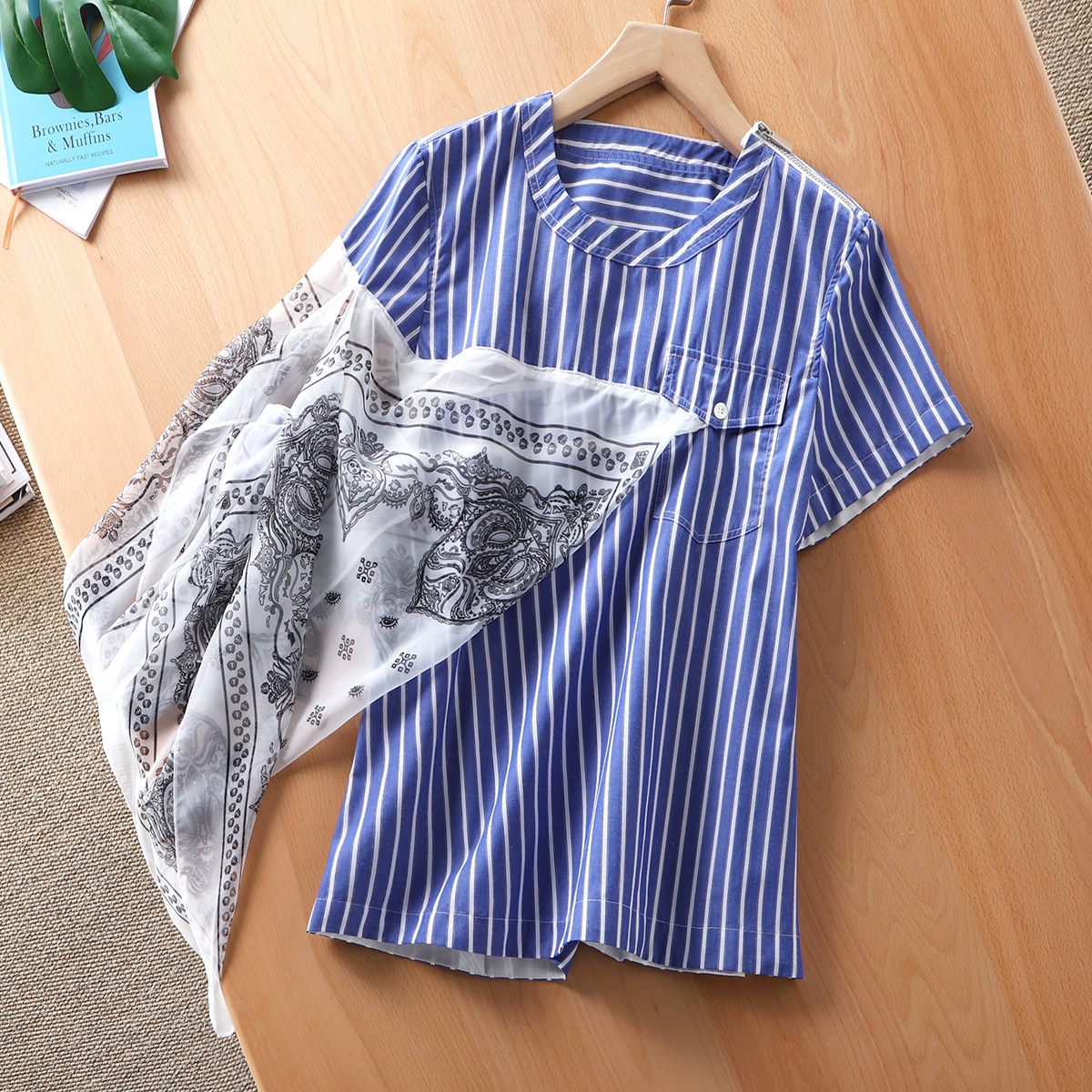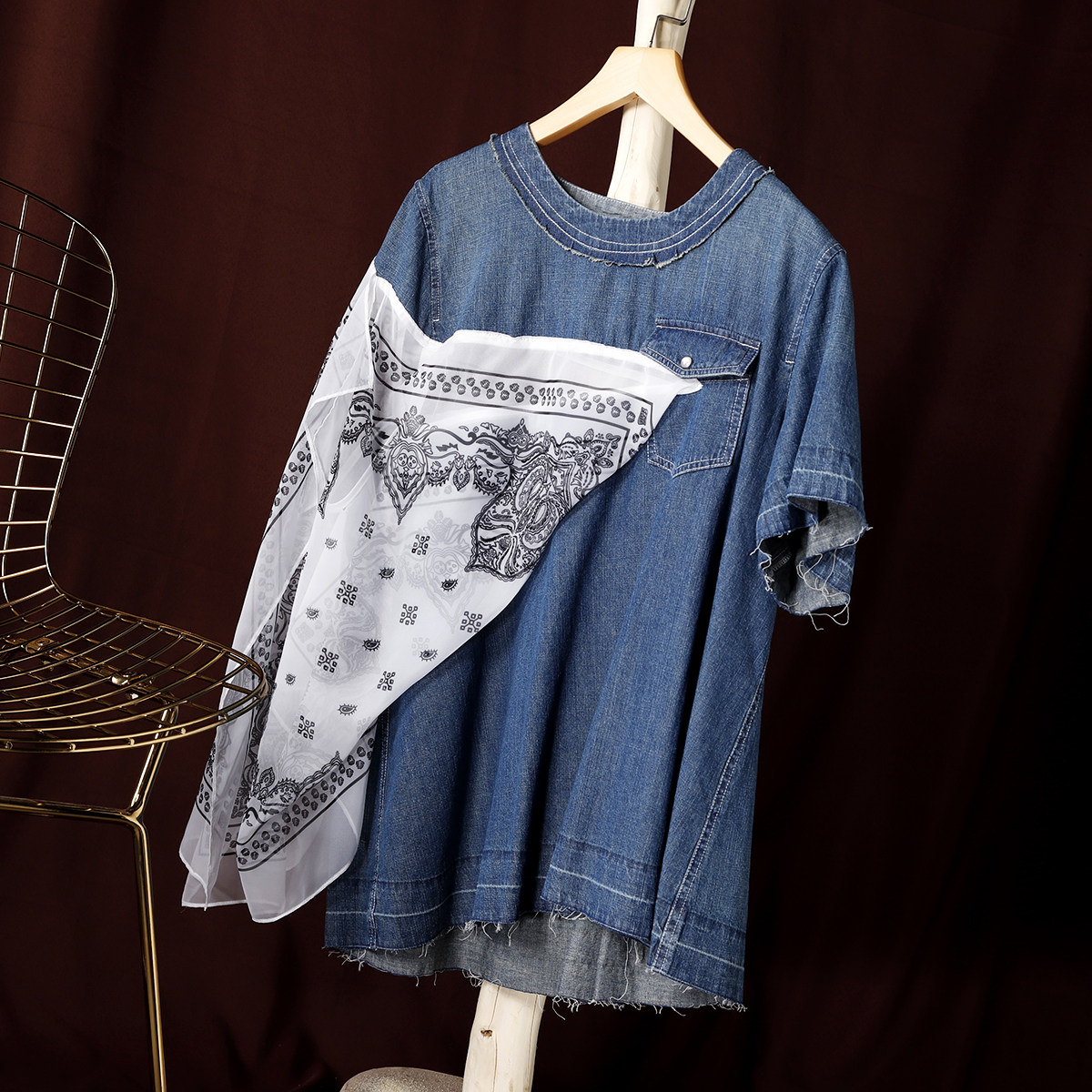 Japanese designer Tidal Wire Ribbon splicing Heavy Industry washed female round collar short sleeve denim shirt blouses 66760