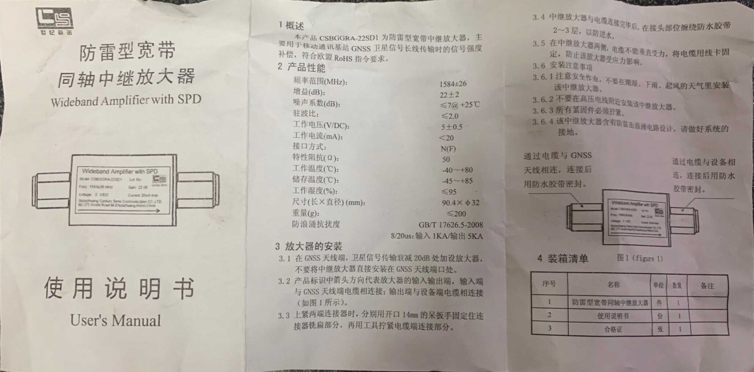 Beidou GPS Signal Amplifier Repeater CSGPSRA Low Noise Feeder Compensator GNSS Time Service Antenna