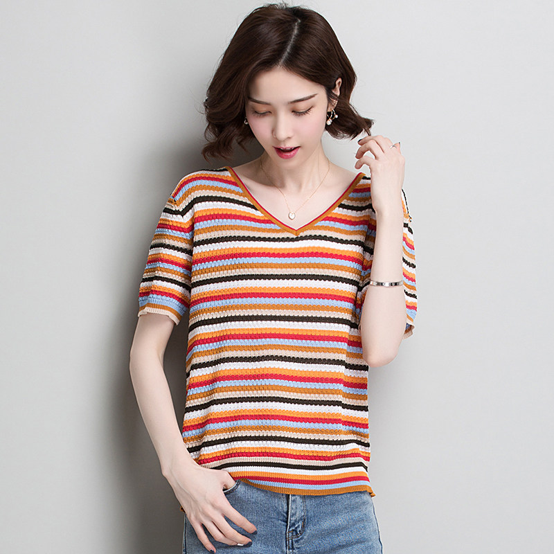 Super hot cec short-sleeved front-shoulder T-shirt women's 2022 new summer dress loose V-neck striped knitted top ice silk t-shirt