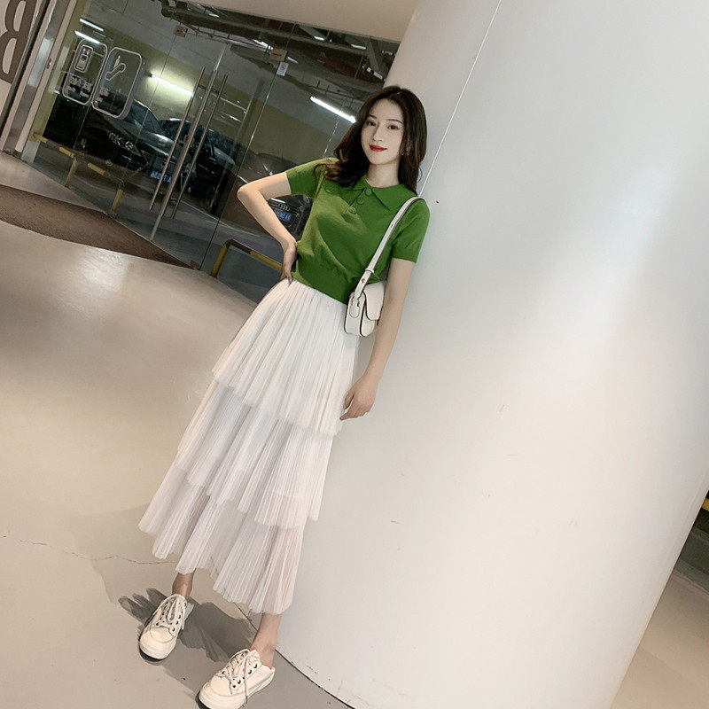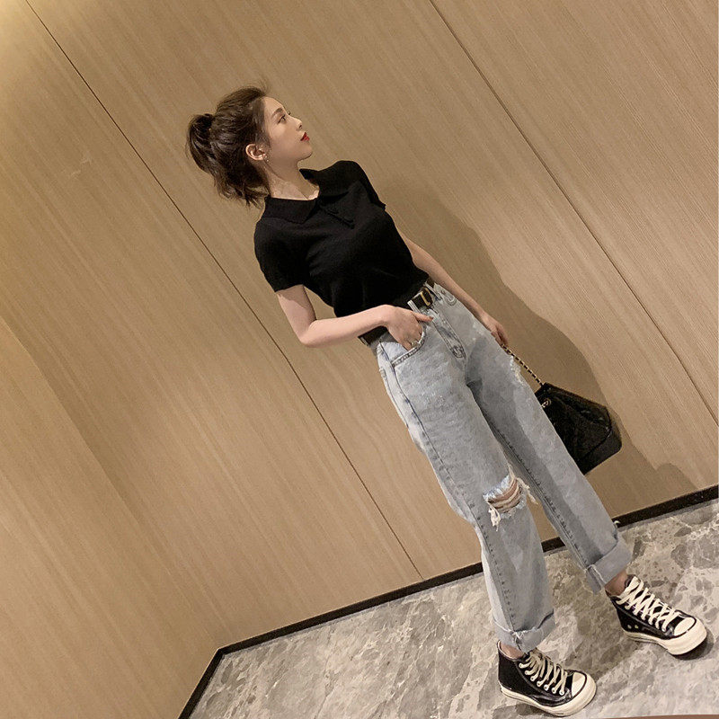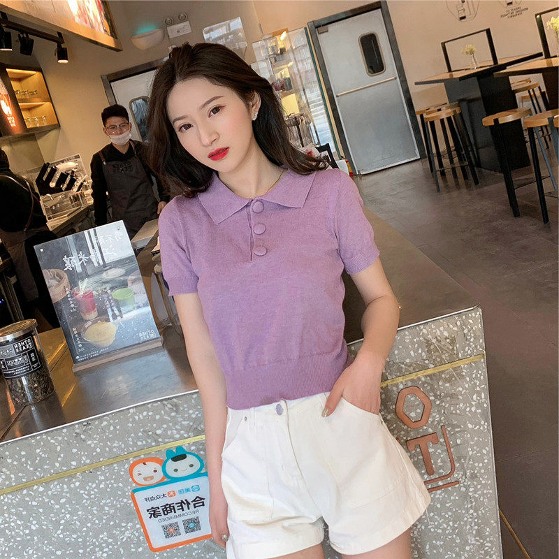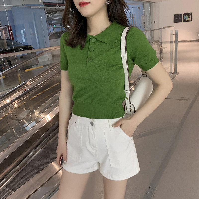2022 summer new Korean version of the Polo collar short-sleeved knitted shirt for female students chic slim casual top