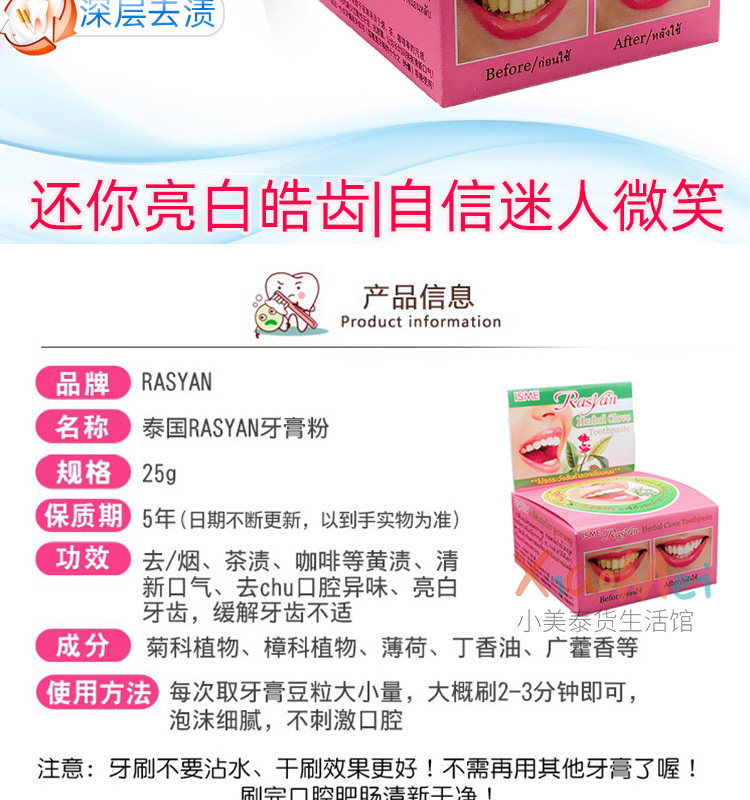 Thailand rasyan tooth powder whitening yellow fresh breath cleaning Wash white to remove yellow and black stains Smoke stains Tartar tooth cleaning powder