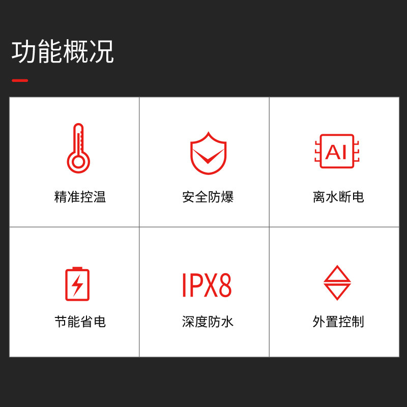 300W frequency conversion constant temperature saving heating rod (suitable for 100-200L water capacity) 500W frequency conversion constant temperature saving heating rod (suitable for 200-300L water capacity) 800W frequency conversion constant temperature saving heating rod (suitable for 300-500L water capacity) 1000W frequency conversion constant temperature saving heating rod (suitable for water capacity above 500L)