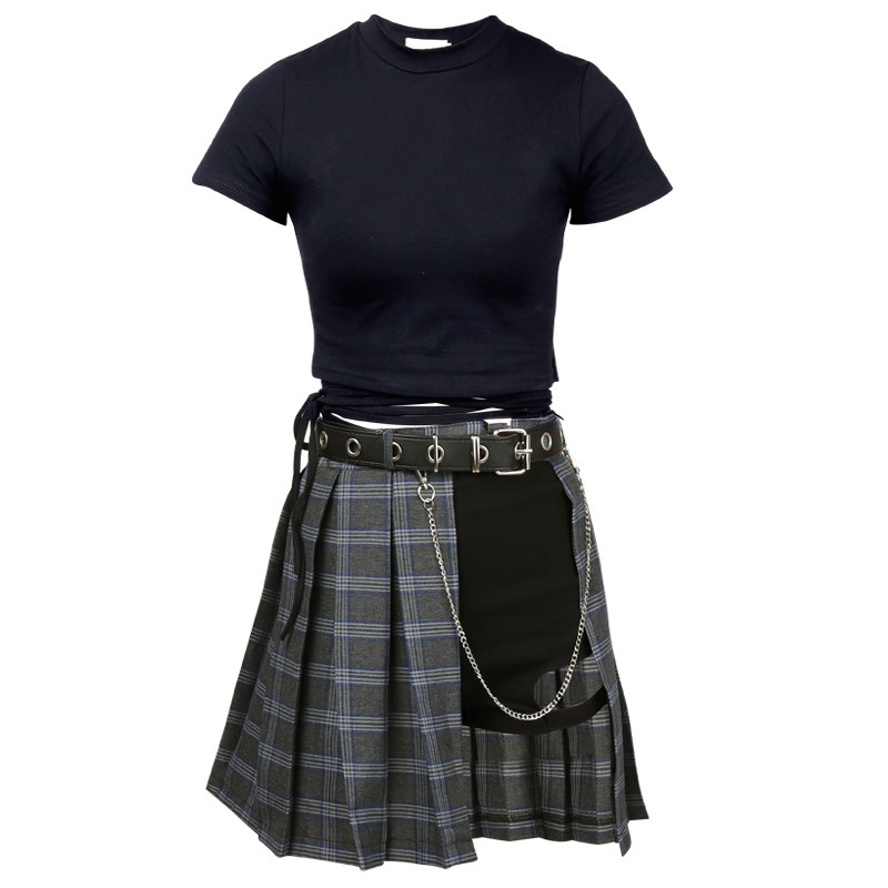 Single piece short sleeve T-shirt shorts single piece checkered leather strap single piece black dress single piece long sleeve T-shirt